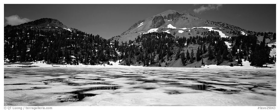 Melting ice in lake and Lassen Peak. Lassen Volcanic National Park (Panoramic)