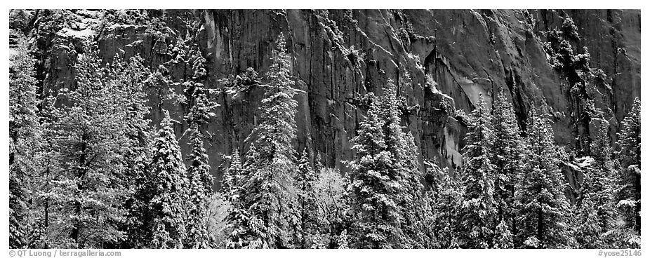 Snow-covered trees and dark cliff. Yosemite National Park (Panoramic)