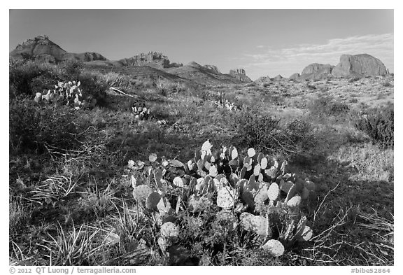 Cactus and Chisos Mountains. Big Bend National Park, Texas, USA.