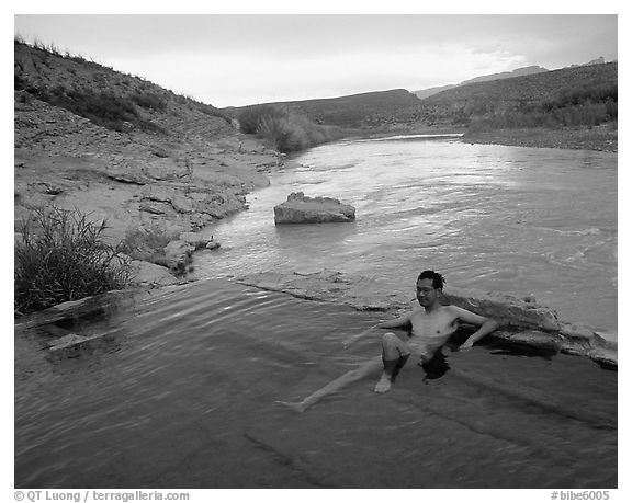 Visitor relaxes in hot springs next to Rio Grande. Big Bend National Park, Texas, USA.