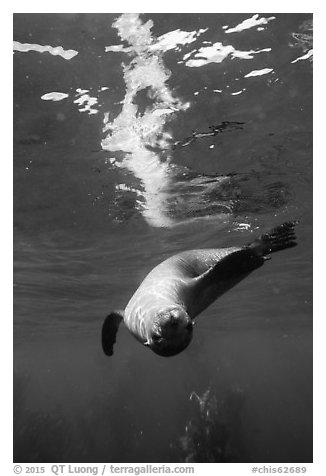 Sea lion swimming upside down with surface reflection, Santa Barbara Island. Channel Islands National Park, California, USA.