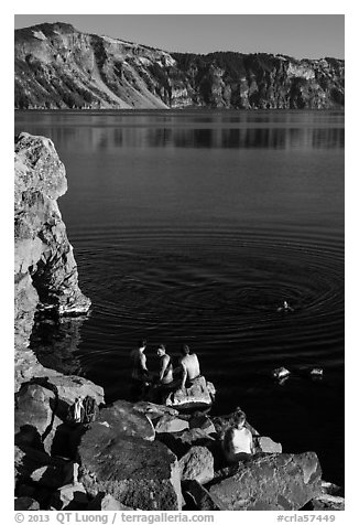 People on lakeshore, Cleetwood Cove. Crater Lake National Park, Oregon, USA.