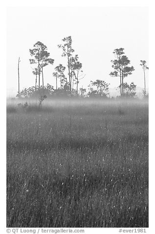 Slash pine trees, sawgrass prairie and fog at sunrise. Everglades National Park, Florida, USA.