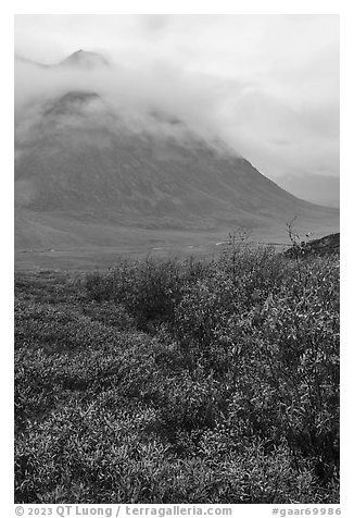 Willows and Kollutuk Mountain in the rain. Gates of the Arctic National Park, Alaska, USA.