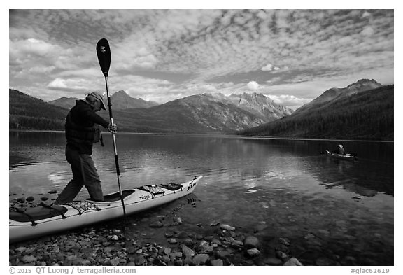 Kayaker steps into kayak, Kintla Lake. Glacier National Park, Montana, USA.