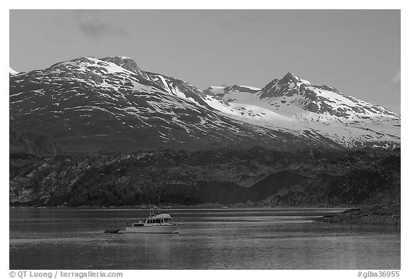 Small boat in Tarr Inlet, early morning. Glacier Bay National Park, Alaska, USA.