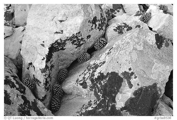 Lichen covered rocks and pine cones. Great Basin National Park, Nevada, USA.