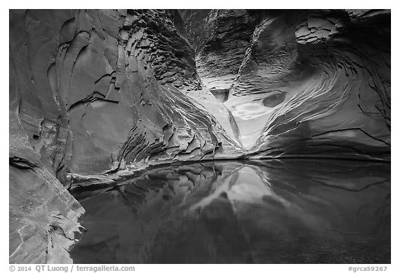 Reflection pool at base of sculpted spillway, North Canyon. Grand Canyon National Park, Arizona, USA.
