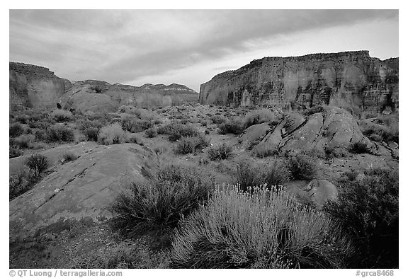 Flowers and wall in Surprise Valley near Tapeats Creek, sunset. Grand Canyon National Park, Arizona, USA.