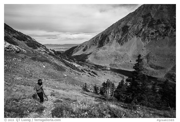 Hiker above Medano Lakes. Great Sand Dunes National Park and Preserve, Colorado, USA.