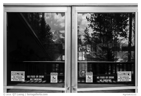 Jackson Lake and Tetons, Colter Bay Visitor Center window reflexion. Grand Teton National Park, Wyoming, USA.
