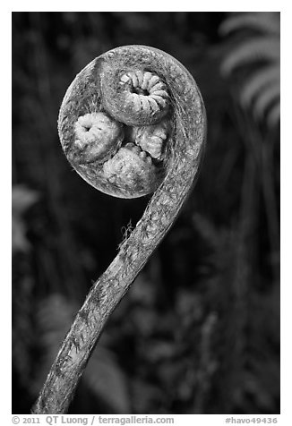 Curled up fiddlehead of Hapuu fern. Hawaii Volcanoes National Park, Hawaii, USA.