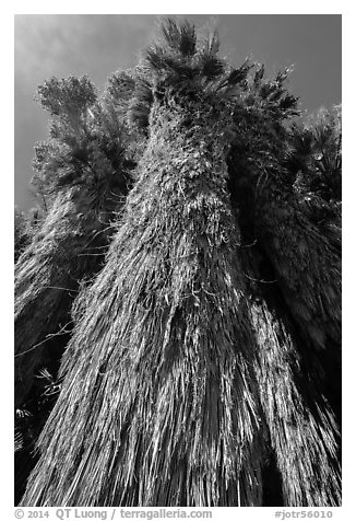 Looking up frond skirt of California fan palm tree. Joshua Tree National Park, California, USA.