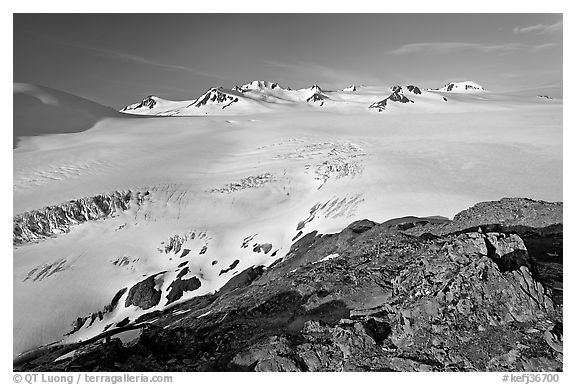 Lichen-covered rocks and Harding ice field. Kenai Fjords National Park, Alaska, USA.