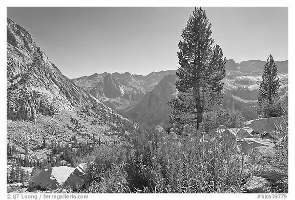 Fireweed and pine trees above Le Conte Canyon. Kings Canyon National Park, California, USA.
