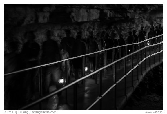 Motion blurred visitors holding lanterns. Mammoth Cave National Park, Kentucky, USA.
