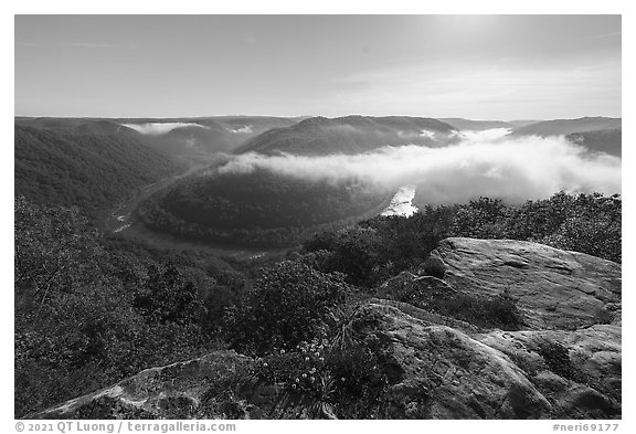 Bend of New River from Grandview with low clouds. New River Gorge National Park and Preserve, West Virginia, USA.