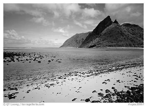 Tropical beach with sand and pebbles, and pointed peaks of Ofu Island. National Park of American Samoa