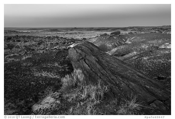 Long petrified longs and badlands at dawn. Petrified Forest National Park, Arizona, USA.