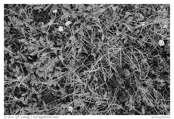 Close-up of grasses, wildflowers, fallen pine cones. Rocky Mountain National Park, Colorado, USA.