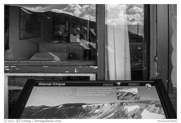 Interpretive sign and Alpine Visitor Center window reflexion. Rocky Mountain National Park, Colorado, USA.