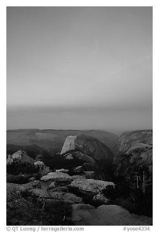 Half-Dome and Yosemite Valley under pink hues of dawn sky. Yosemite National Park, California, USA.