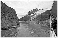 Small boat in Aialik Bay. Kenai Fjords National Park ( black and white) Passengers with red jackets on bow of tour boat, Northwestern Fjord. Kenai Fjords National Park ( black and white) Mountains reflected in fjord, seen by tour boat passengers, Northwestern Fjord. Kenai Fjords National Park ( black and white) Vistors on bow of tour boat approaching glacier, Northwestern Fjord. Kenai Fjords National Park ( black and white) Passengers looking at Northwestern glacier from the deck of tour boat. Kenai Fjords National Park ( black and white) People looking at glaciers as boat crosses ice-chocked waters, Northwestern Fjord. Kenai Fjords National Park ( black and white) Passengers on the deck of tour boat and Northwestern glacier, Northwestern Lagoon. Kenai Fjords National Park ( black and white) Passenger on small tour boat, island and glacier, Northwestern Fjord. Kenai Fjords National Park ( black and white) Passengers looking at waterfalls from  bow of tour boat, Cataract Cove. Kenai Fjords National Park ( black and white) Waterfall viewing from deck of tour boat, Cataract Cove. Kenai Fjords National Park ( black and white) Passengers look at waterfall from tour boat, Cataract Cove, Northwestern Fjord. Kenai Fjords National Park ( black and white)