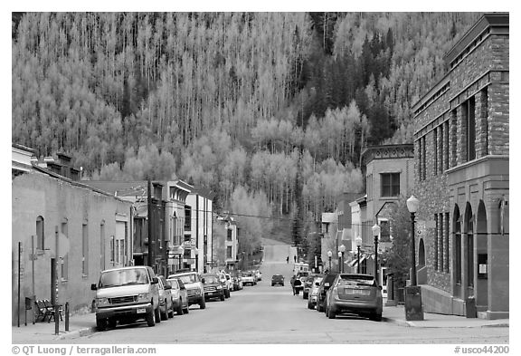 Historic brick buildings and slope with newly leafed aspens. Telluride, Colorado, USA