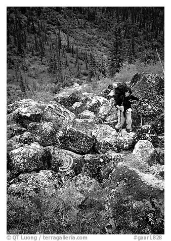 Backpacker on boulder field in Arrigetch Creek. Gates of the Arctic National Park, Alaska