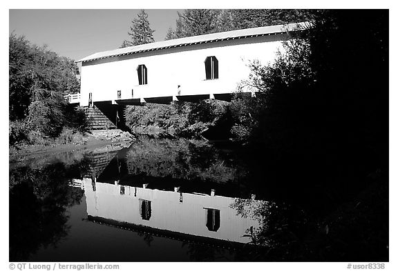 White covered Bridge reflected in river, Willamette Valley. Oregon, USA