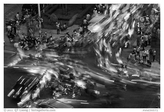 Long exposure traffic trails on busy intersection from above at night. Ho Chi Minh City, Vietnam