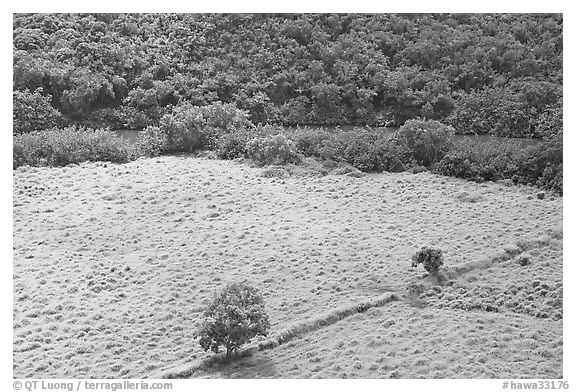 Trees, field, and ancient wall, Wailua River Valley. Kauai island, Hawaii, USA
