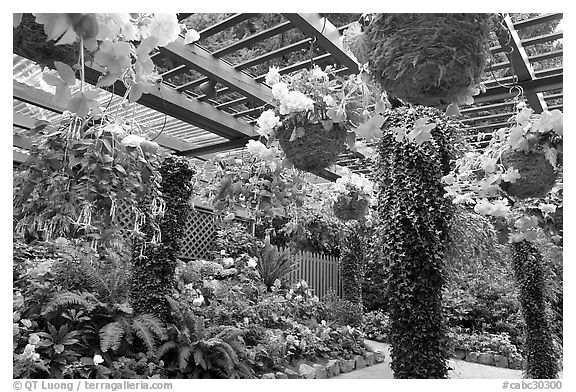 Bower overflowing with hanging baskets of begonias and fuchsias. Butchart Gardens, Victoria, British Columbia, Canada