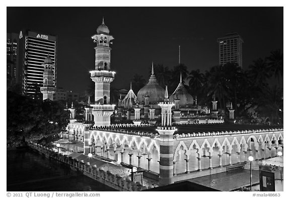 Prayer hall, Masjid Jamek, night. Kuala Lumpur, Malaysia