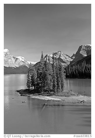Evergreens on Spirit Island, Maligne Lake, afternoon. Jasper National Park, Canadian Rockies, Alberta, Canada