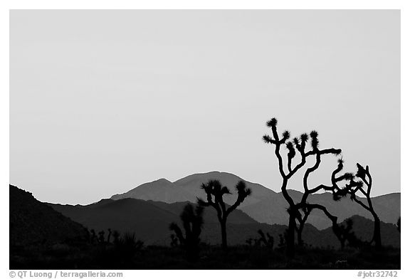 Joshua trees and mountains, sunset. Joshua Tree National Park, California, USA.