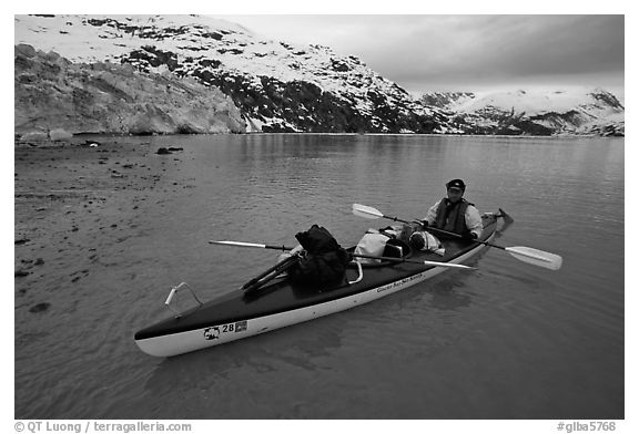 Kayaker sitting in loaded double kayak near Lamplugh Glacier. Glacier Bay National Park, Alaska