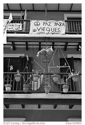 Facade of house painted in blue with plant pots and balconies. San Juan, Puerto Rico