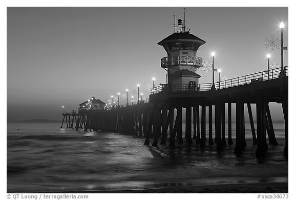 Huntington Pier lights at twilight. Huntington Beach, Orange County, California, USA