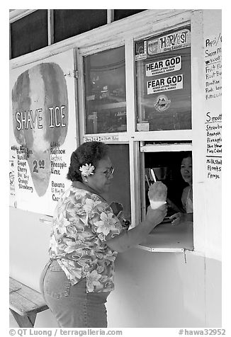 Woman with a flower in her hair getting shave ice, Waimanalo. Oahu island, Hawaii, USA