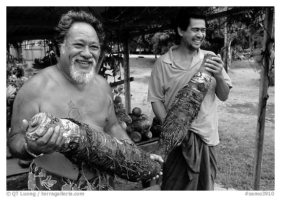 Islanders holding Taro roots in Iliili. Tutuila, American Samoa