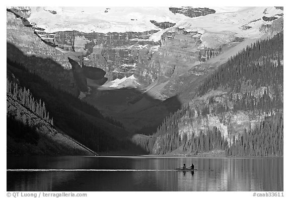 Rowers on Lake Louise, below Victoria Glacier, early morning. Banff National Park, Canadian Rockies, Alberta, Canada