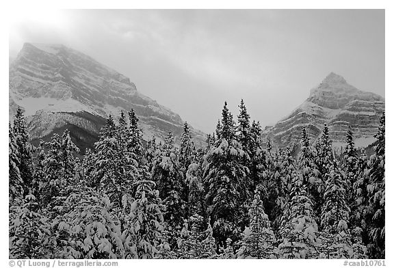 Conifer sand foggy peaks in winter. Banff National Park, Canadian Rockies, Alberta, Canada