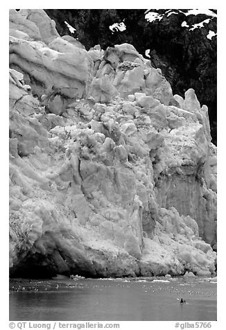 Kayaker dwarfed by Lamplugh Glacier. Glacier Bay National Park, Alaska