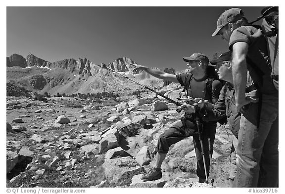 Hikers pointing, Dusy Basin. Kings Canyon National Park, California