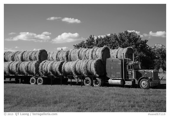 Truck loaded with hay rolls, Medora. North Dakota, USA