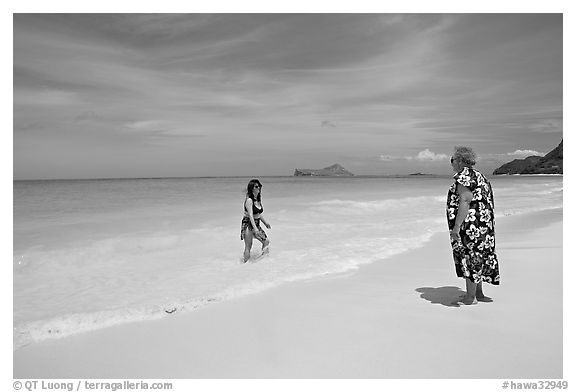 Two women, the Older in hawaiian dress, on Waimanalo Beach. Oahu island, Hawaii, USA