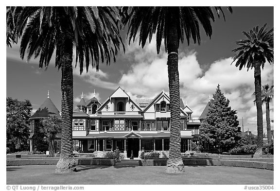 Palm trees and mansion facade. Winchester Mystery House, San Jose, California, USA