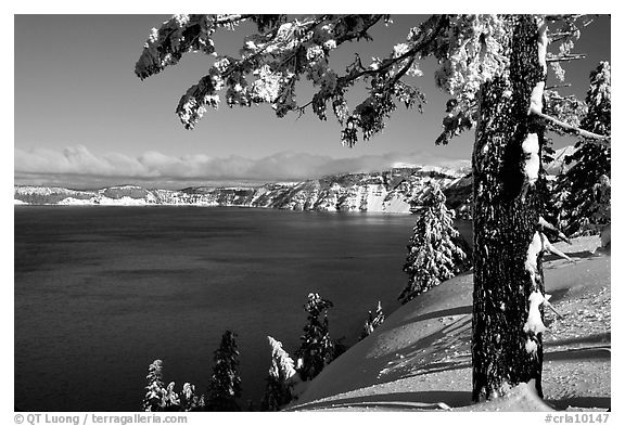 Pine tree with fresh snow on lake rim. Crater Lake National Park, Oregon, USA.