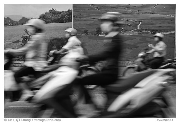 Motorbike riders speeding in front of backdrops depicting traditional landscapes. Ho Chi Minh City, Vietnam